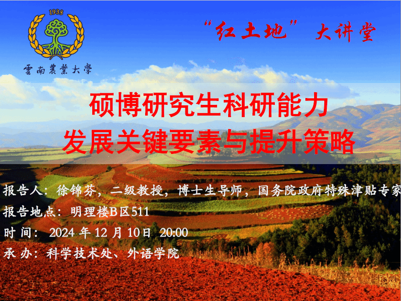 12月10日“紅土地”大講堂:碩博研究生科研能力發展關鍵要素與提升策略