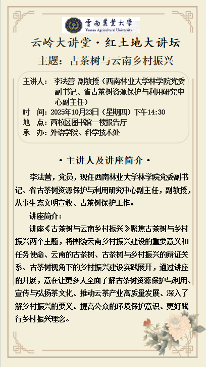 10月23日“云嶺”大講堂 “紅土地”大講壇:古茶樹與云南鄉村振興