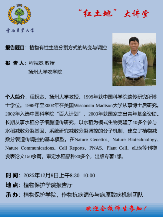 12月9日“紅土地”大講堂:植物有性生殖分裂方式的轉(zhuǎn)變與調(diào)控