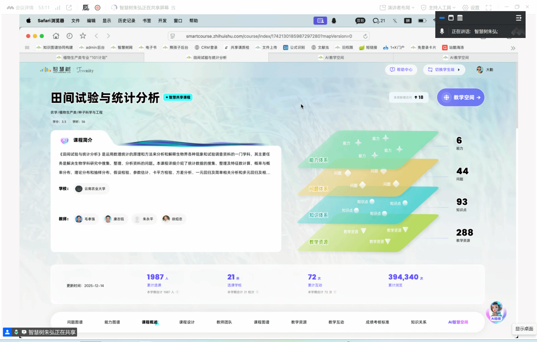 會(huì)上,課程負(fù)責(zé)人康志鈺教授介紹了地方“101計(jì)劃”實(shí)施情況以及課程建設(shè)情況,劉雅婷教授對(duì)課程建設(shè)和會(huì)議提出了要求,然后由智慧樹平臺(tái)朱弘老師就《田間試驗(yàn)與統(tǒng)計(jì)分析》智慧課程的使用進(jìn)行了培訓(xùn)。